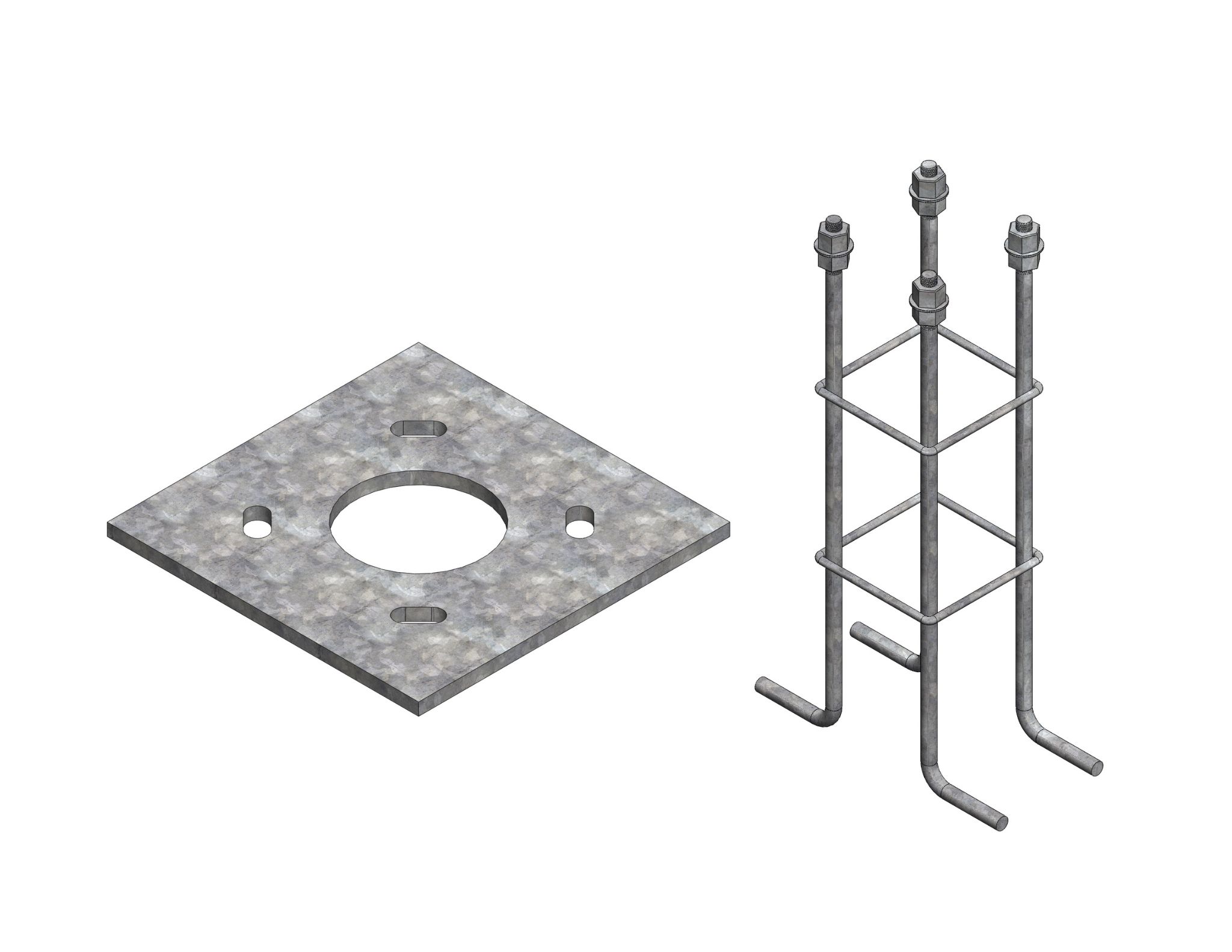 Kit de fundación compuesto por canastillo de 1/2″x500 mm y placa 200x200x10 mm para instalación de postes.